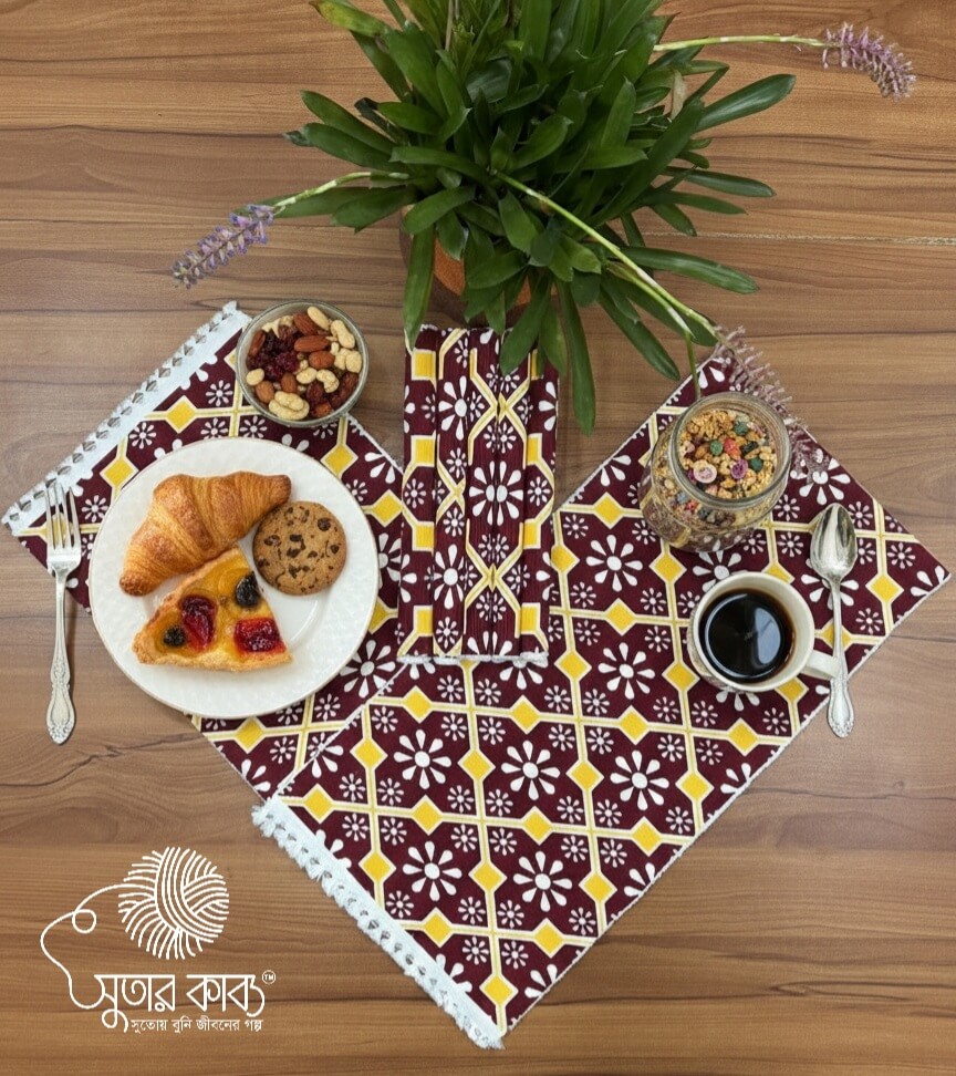 Transform your dining space into a work of art with the Sutar Kabbo Geometric Floral Table Runner. This stunning piece features a rich maroon backdrop adorned with a crisp white floral motif and vibrant yellow geometric accents, creating a sophisticated “aesthetic” that bridges the gap between traditional craft and modern bohemian style.