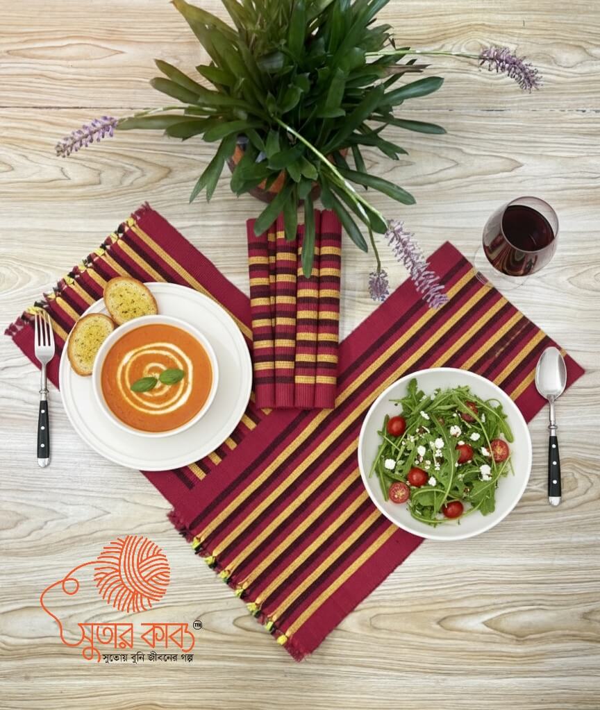 Enhance your dining experience with this handloom woven table runner set, featuring a rich red base accented with yellow stripes. Woven on a traditional hand loom by skilled artisans, this set brings warmth, elegance, and a handcrafted touch to your dining or coffee table.