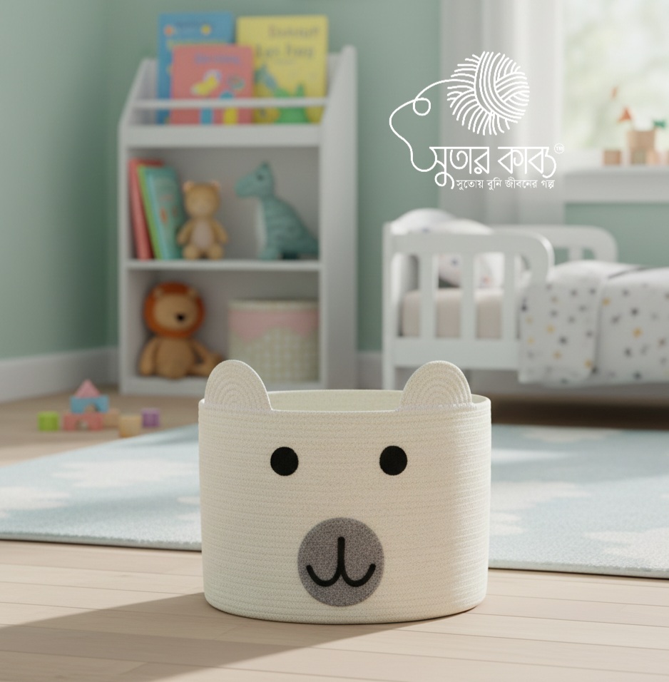 Keep your child’s room organized and stylish with this premium handmade Jute rope basket from Sutor Kabbo. Crafted from natural, high-quality cotton yarn, this basket is both durable and Eco-friendly. Featuring a charming rabbit face design with soft ears, it adds a playful touch to any nursery or playroom decor. Its lightweight yet sturdy construction makes it easy for children to use, while the 1:1 ratio ensures it fits perfectly in compact spaces.
