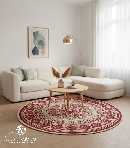 Natural Fiber Round Area Rug – Symmetrical Floral Mandala Rug for Living RoomNatural Fiber Round Area Rug – Symmetrical Floral Mandala Rug for Living Room