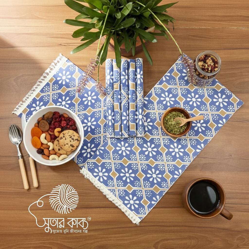 Bring a sense of calm and sophistication to your dining area with the Sutar Kabbo Sky Blue Floral Table Runner. This piece features an intricate, hand-loomed geometric pattern where soft cornflower blue meets warm sandy gold and crisp white floral accents. The result is a high-contrast, “aesthetic” design that feels both timeless and modern.