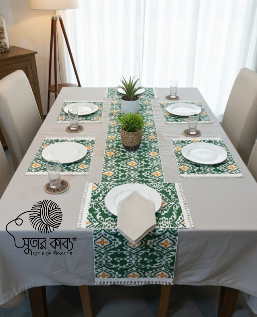 Transform your dining space with the Sutar Kabbo Aesthetic Table Runner Collection. Each runner is a masterpiece of heritage craftsmanship, hand-loomed by skilled artisans to bring an authentic, soulful energy to your home. Our collection features a diverse range of patterns to suit any style—from bold, classic stripes in vibrant crimson to intricate jacquard-style floral geometrics in soothing sage green, earthy terracotta, and regal plum.