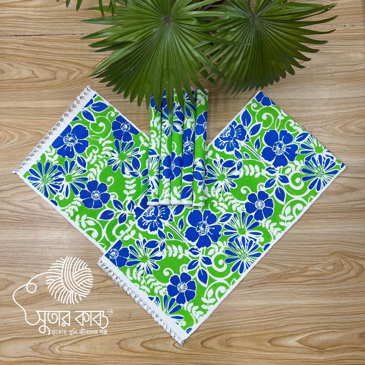 Sutar Kabbo Hand-Loomed Aesthetic Table Runner – Artisan Woven 100% Cotton – Vibrant Blue & Lime Green Floral Geometric Design for Modern Dining
